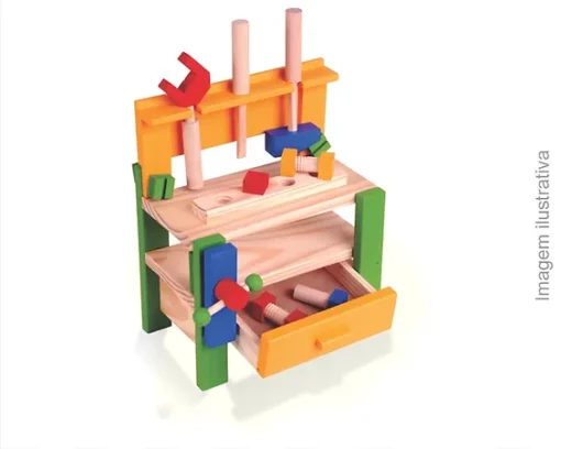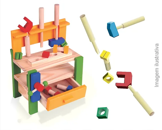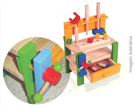 Contém 14 ferramentas diversas em madeira.