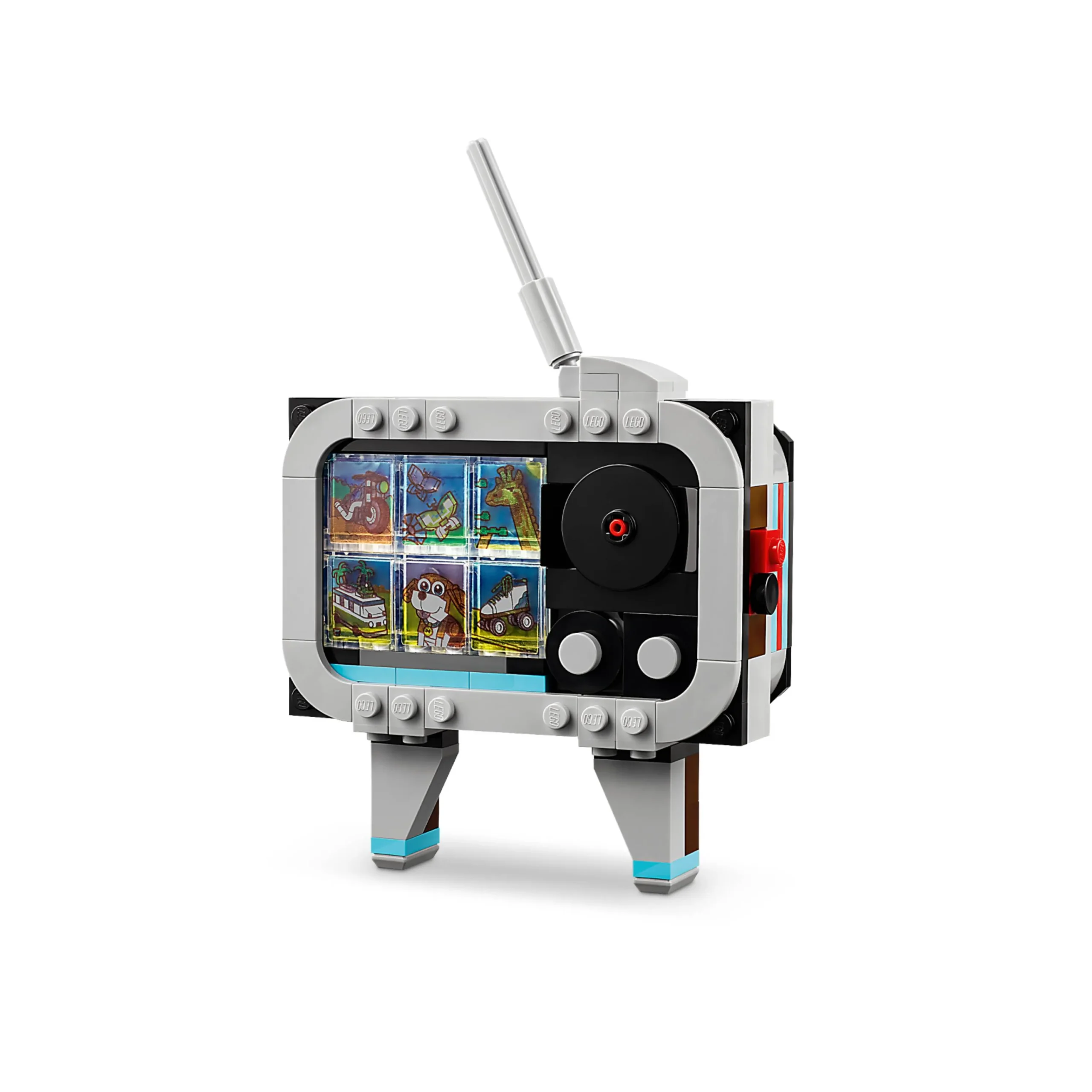 Este conjunto de brinquedos retrô Lego Creator 3 em 1, dá às crianças a oportunidade de desfrutar de 3 experiências diferentes de construir e brincar usando as mesmas peças. Eles podem construir uma câmera de brinquedo infantil e depois reconstruí-la em uma câmera de vídeo retrô, ou em uma TV retrô com antena. Todos os 3 modelos são itens de exibição legais para as crianças colocarem em suas prateleiras.