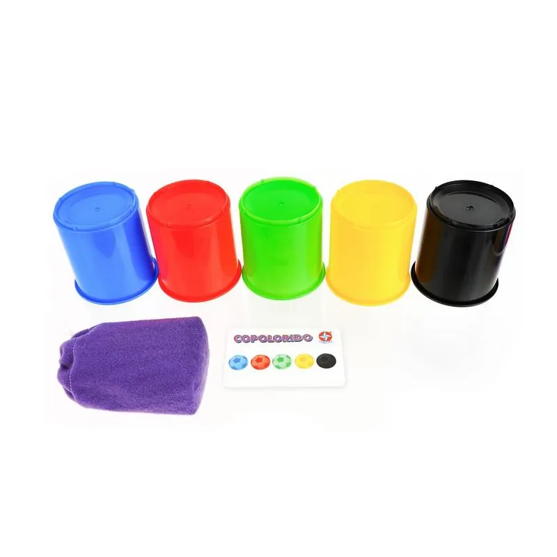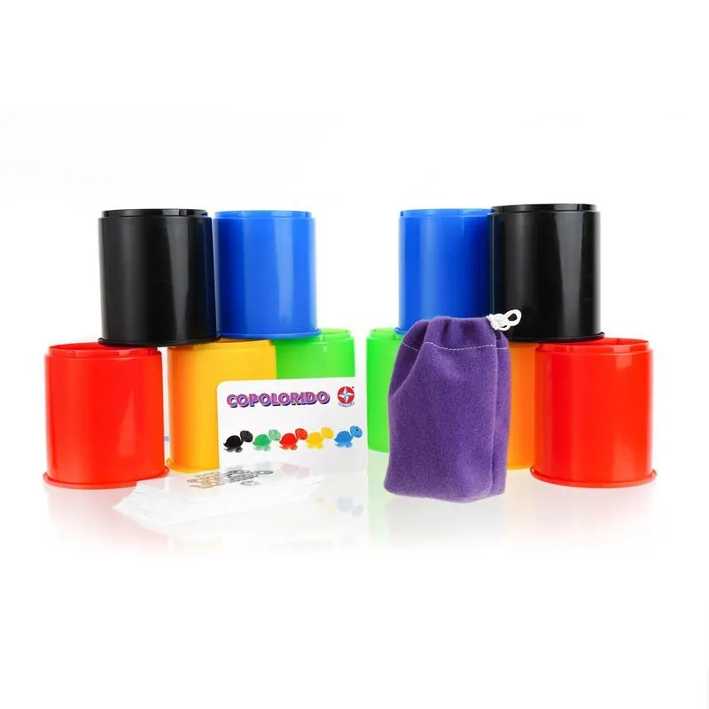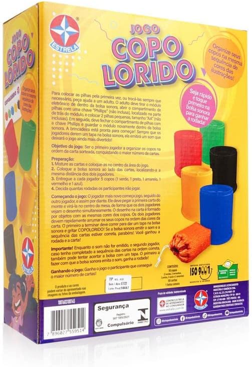 Contém na Embalagem: 50 cartas, 10 copos coloridos (2 verdes, 2 pretos, 2 amarelos, 2 vermelhos e 2 azuis) e 1 bolsa sonora.