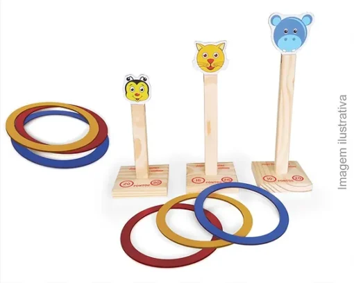O Jogo das Argolas é um jogo onde a criança irá se divertir e brincar livre, lançando a argola no pinos dos animais, tem o gatinho, a abelinha e o hipopótamo.