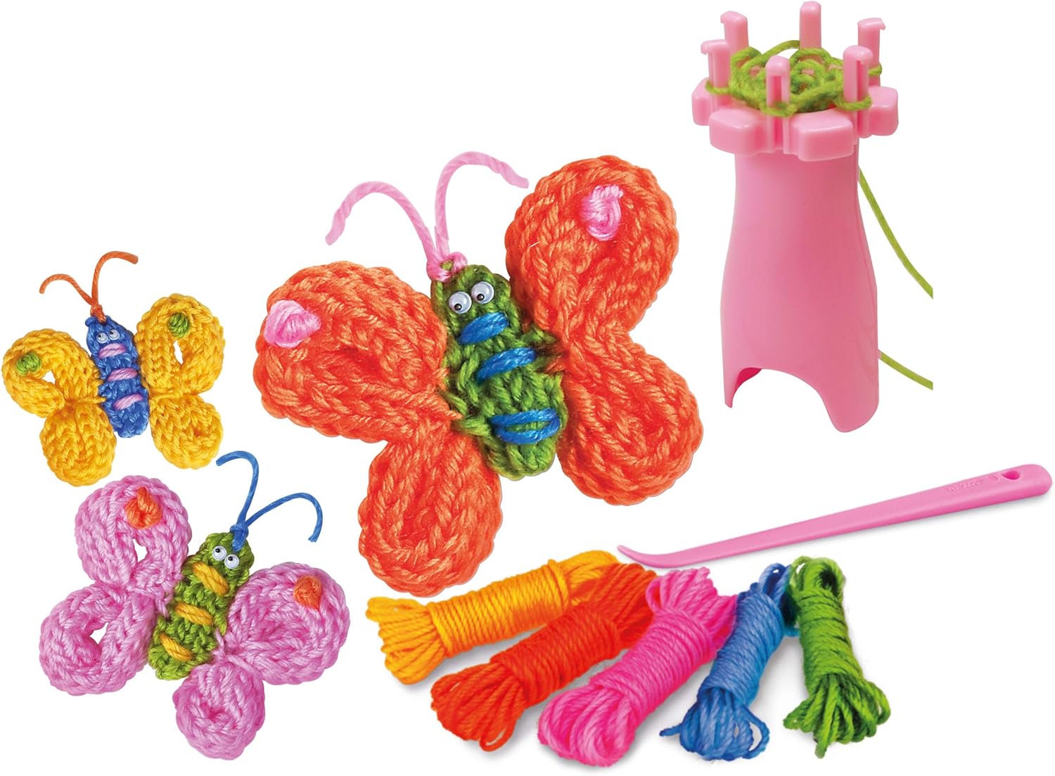 Crie lindas borboletas com fios de malha usando um kit especialmente projetado para crianças. Uma introdução divertida ao tricô.