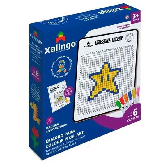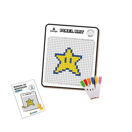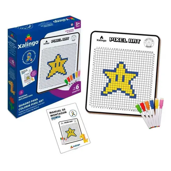 O Quadro para Colorir Pixel Art II, é composto por um quadro de 40 x 35 cm e acompanha também 1 kit com 6 canetinhas coloridas com apagador.