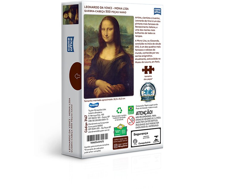 Aproxime-se das pinceladas de Leonardo da Vinci com esse quebra-cabeça de 500 peças nano da Coleção Obras de Arte com textura de tela! Temos um padrão internacional de qualidade e encaixe suave que pode ser sentido em cada peça!