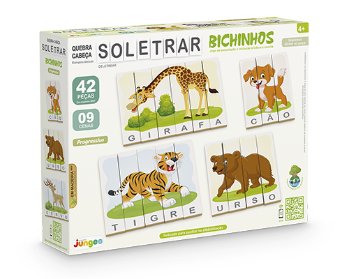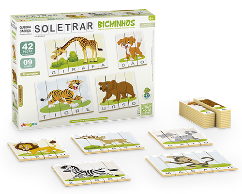 Jogo Quebra-Cabeça Soletrar da Junges com 42 peças em madeira de reflorestamento (MDF), que formam 9 cenas progressivas entre três a seis letras (palavra/figura). Impressão direto na madeira com acabamento de alta qualidade, durabilidade e resistência.