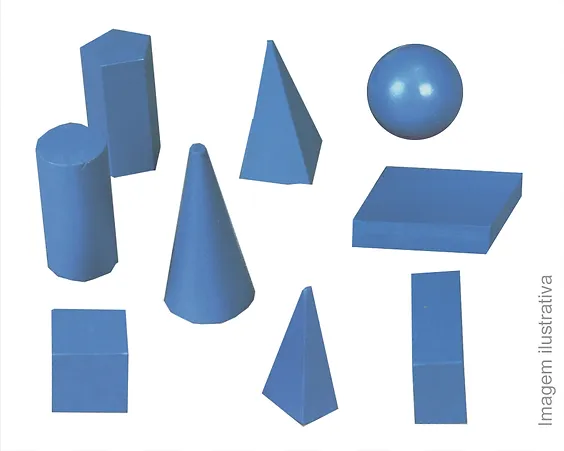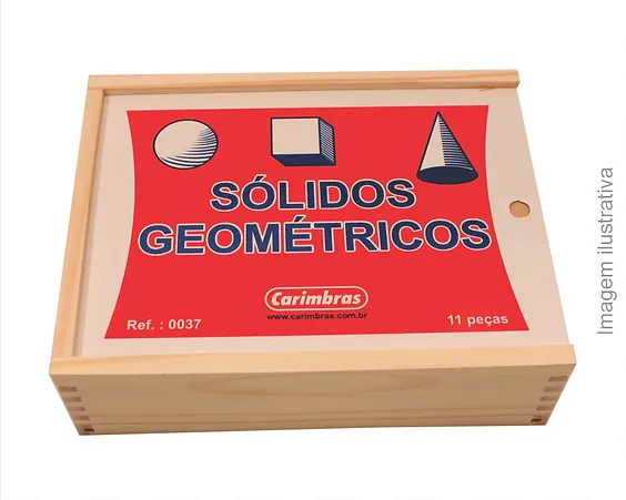 O estojo dos Sólidos Geométricos contém 11 peças em madeira, sendo formado por cones, esferas, pirâmides, paralelepípedos, cilindros, e outros.